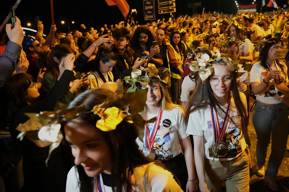 La multitud se congregó en la ciudad de Novi Sad, al norte del país, donde cerca de 80 estudiantes fueron recibidos como héroes, caminaron sobre una alfombra roja y recibieron medallas simbólicas, en reconocimiento a su esfuerzo iniciado a principios de abril.