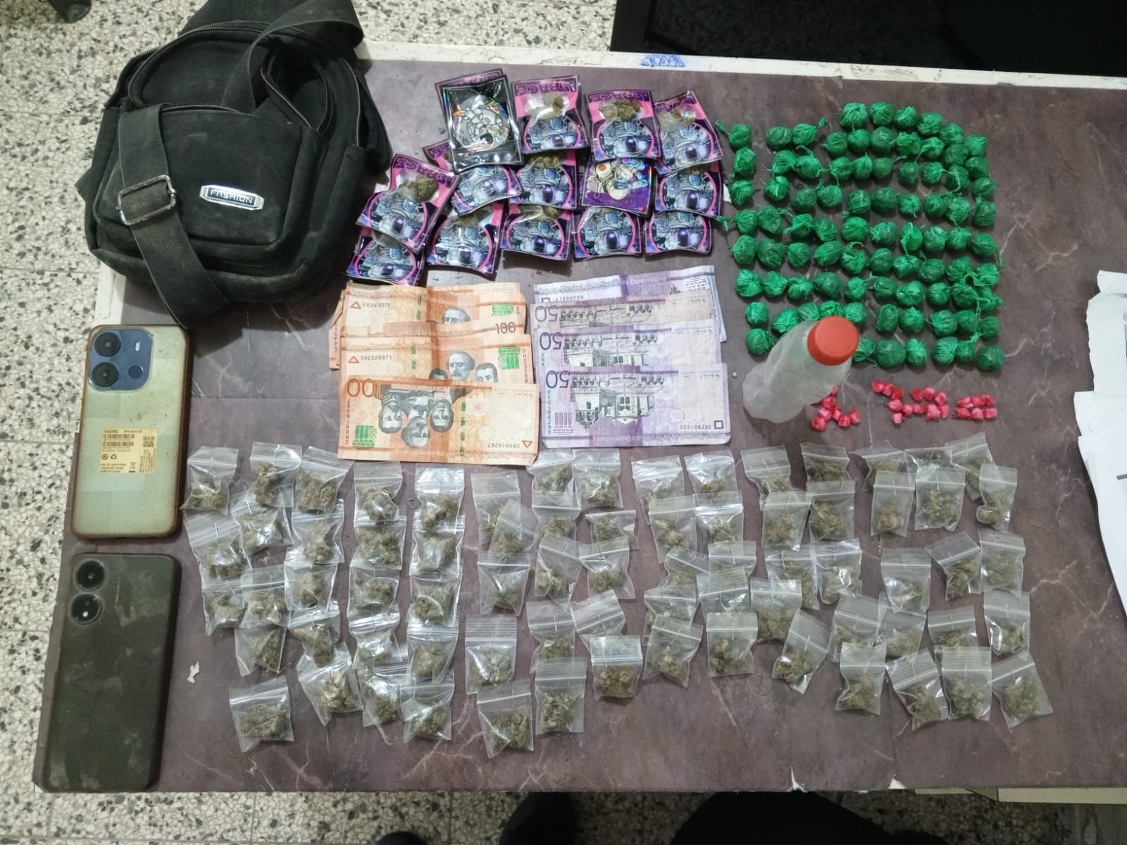 De acuerdo con el informe preliminar, ambos individuos intentaron huir al notar la presencia policial, pero fueron interceptados de inmediato. Durante su detención, se les confiscó un bulto tipo mariconera, que contenía un pote transparente con 26 porciones de una sustancia rocosa, presumiblemente crack, envueltas en pedazos de funda color rosado; 73 porciones de presunta marihuana, envueltas en fundas transparentes; 86 porciones de un vegetal similar, y 15 porciones adicionales en fundas tipo ziploc.