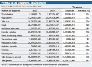 Santo Domingo, República Dominicana – Al cierre del 2024, la Superintendencia de Seguros reportó que las primas netas cobradas en seguros alcanzaron un total de RD$135,354.2 millones, lo que representa un incremento absoluto de RD$20,008 millones (17.3%) en comparación con el año anterior.